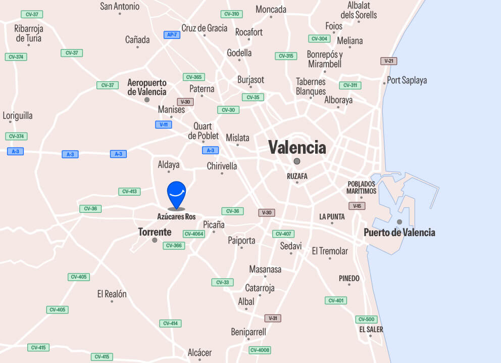 Azúcares Ros está ubicada dentro del eje del corredor Mediterráneo y a menos de 15 km. del Puerto de Valencia, lo cual favorece tanto la entrada como la salida de mercancía por mar.